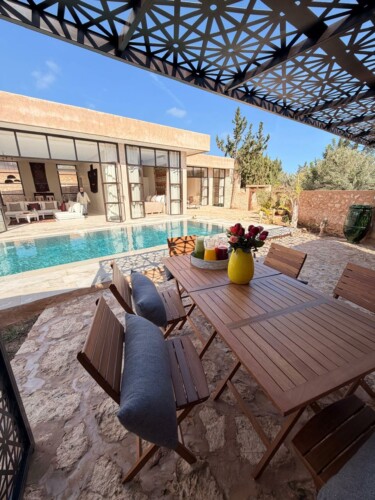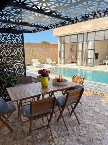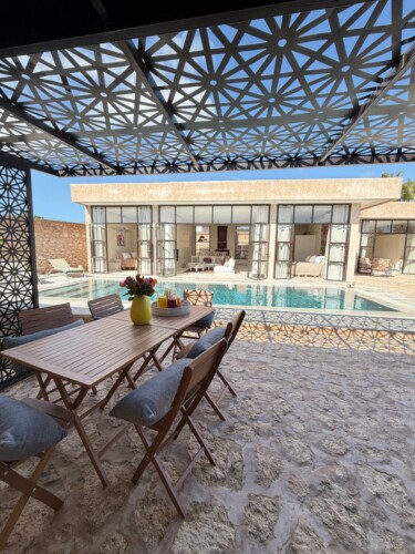 À l’extérieur, la villa s’ouvre sur une piscine privée aux nuances bleu profond, bordée d’une pergola design, de transats et d’un espace repas en plein air, un cadre idéal pour savourer les après-midi ensoleillés et les dîners sous les étoiles.